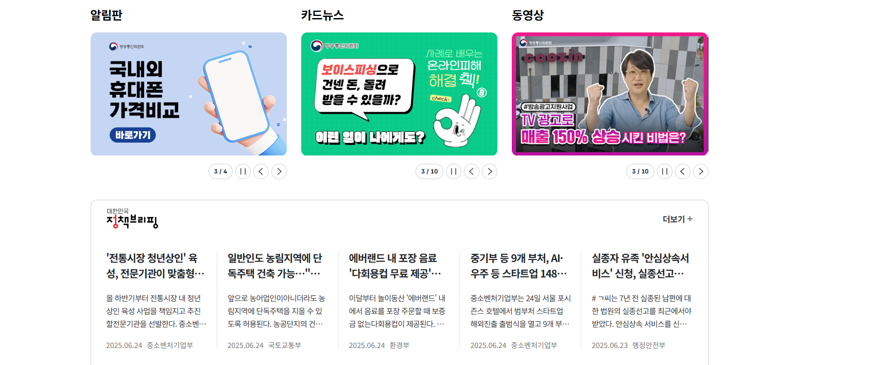 - 정책 이슈, 법령, 추진계획, 자료실, 보도자료, 카드뉴스, 홍보영상 등 다양한 정보 공개.