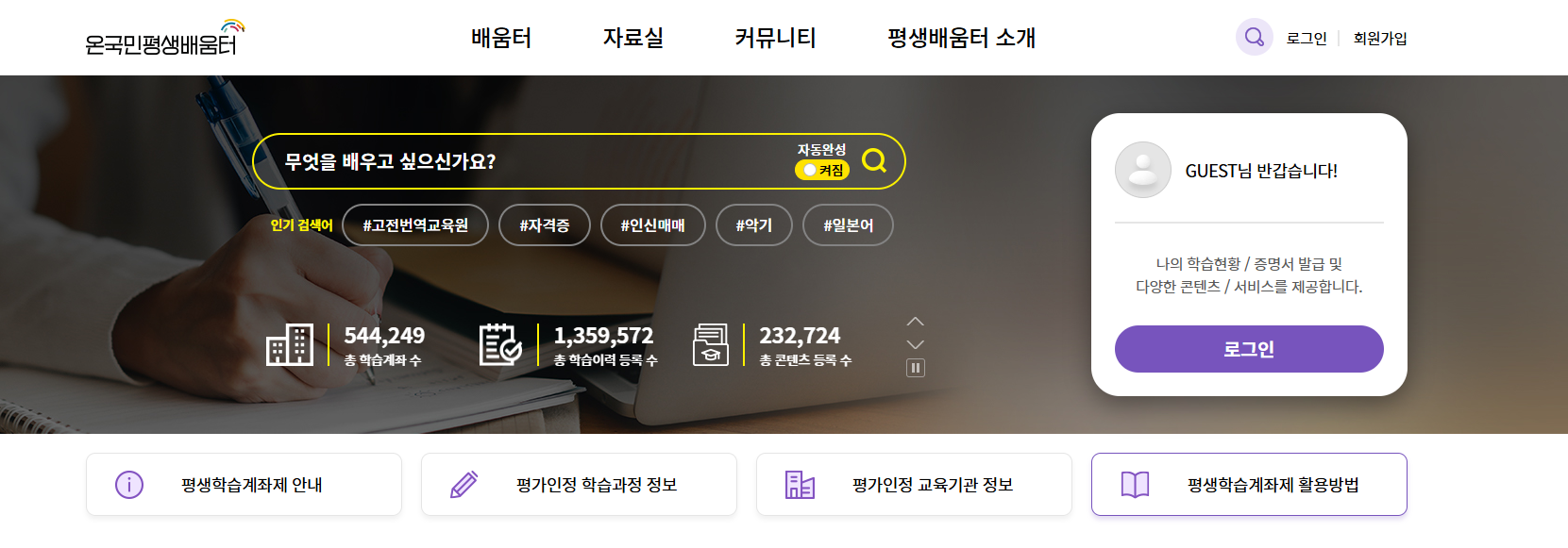 전국의 다양한 학습 정보를 한눈에 검색하고 수강할 수 있는 포털 사이트입니다.