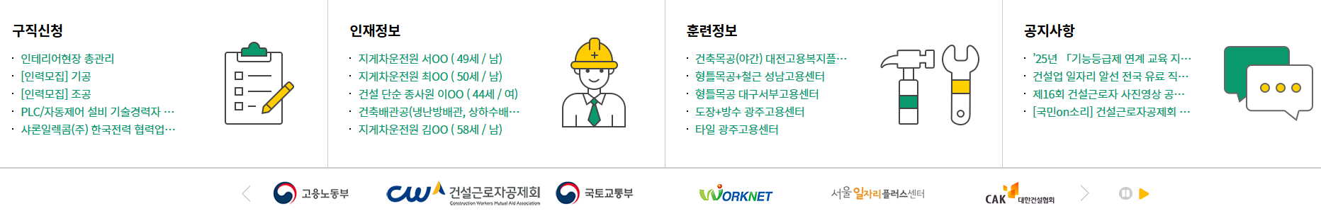 - 건설일드림넷은 건설 근로자에게 특화된 취업+훈련 통합 플랫폼입니다.
