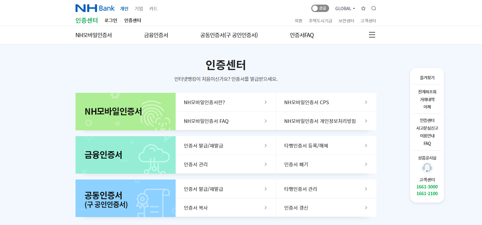 | 은행/보험용 공동인증서 | 농협 인터넷뱅킹, 보험, 신용카드 결제, 전자정부 민원 서비스 등 | 무료 |